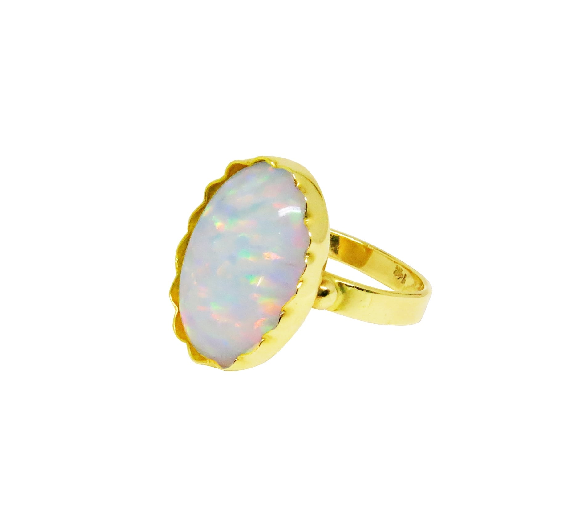 | טבעת זהב 14K. מעוצבת בצורת אובל משובצת באבן חן אופל לבנה מנצנצת עבודת יד. |