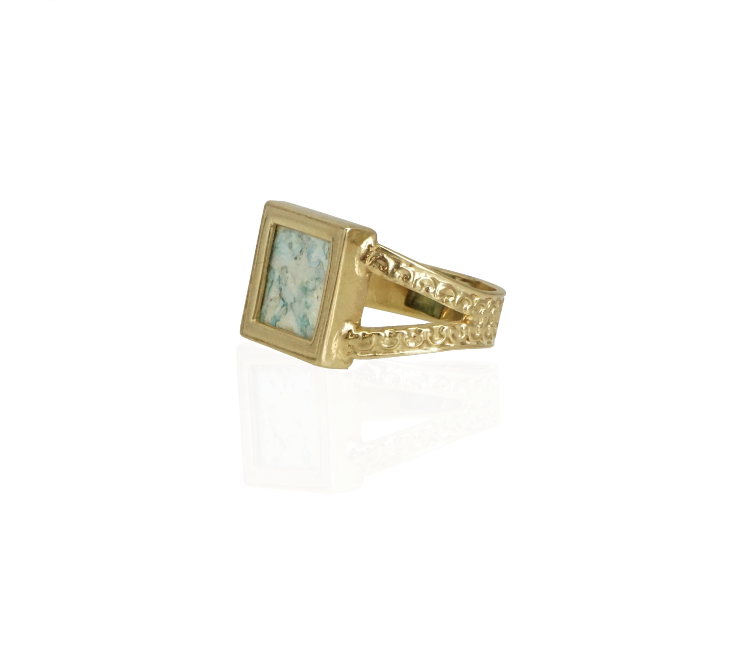 טבעת זהב עם זכוכית רומית │ טבעת זהב מעוצבת עבודת יד בשילוב זכוכית רומית