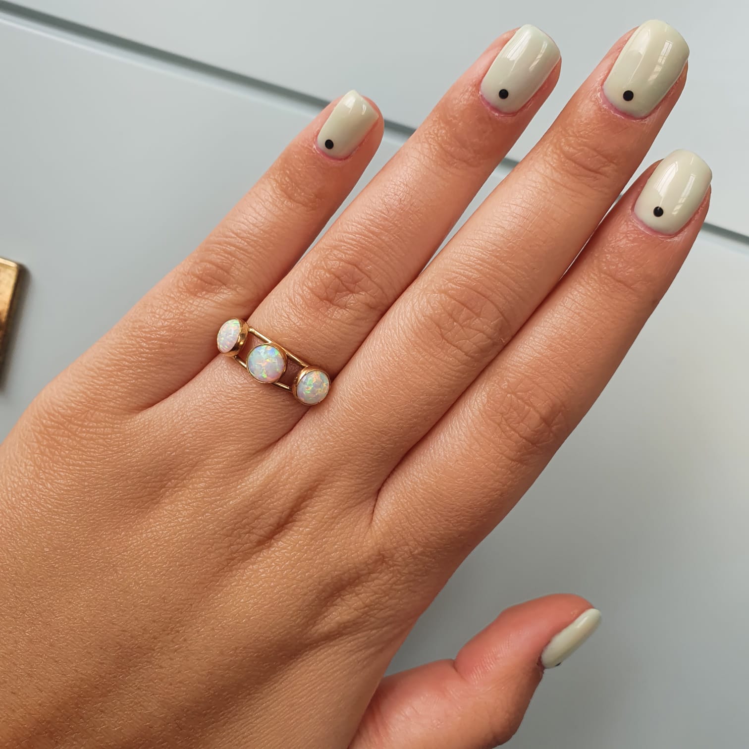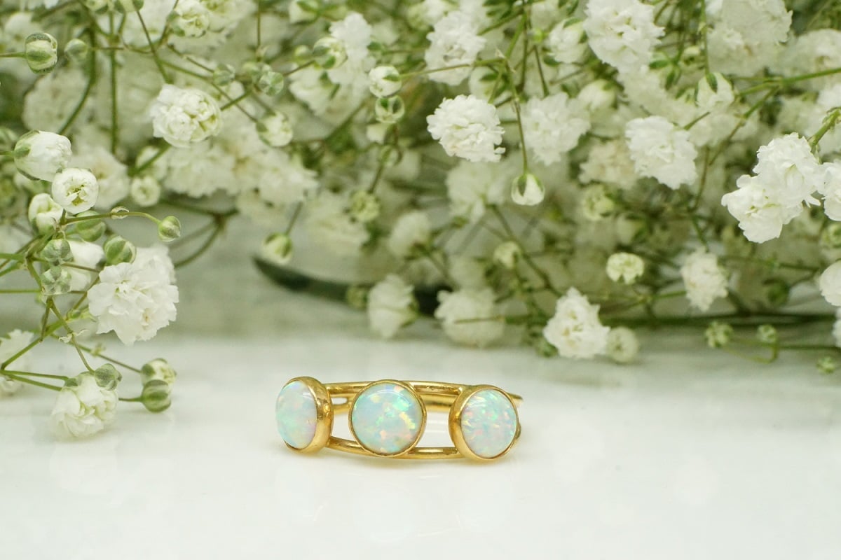 | טבעת זהב 14K. משובצת בשלושה אבני חן אופל לבנות מנצנצות בעבודת יד. |