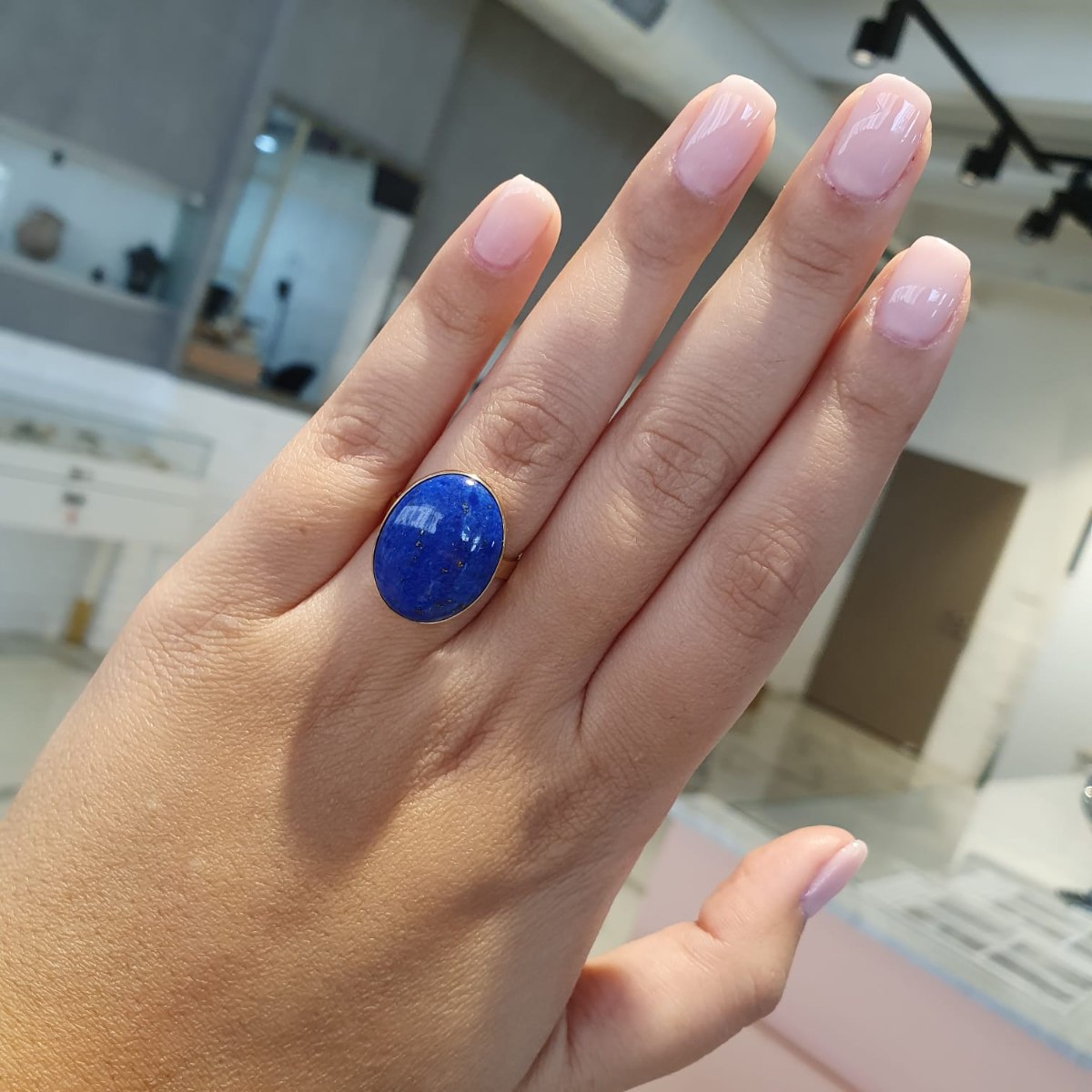 טבעת משובצת אבן לפיס כחולה אובלית גדולה מרשימה ומלאת נוכחות.