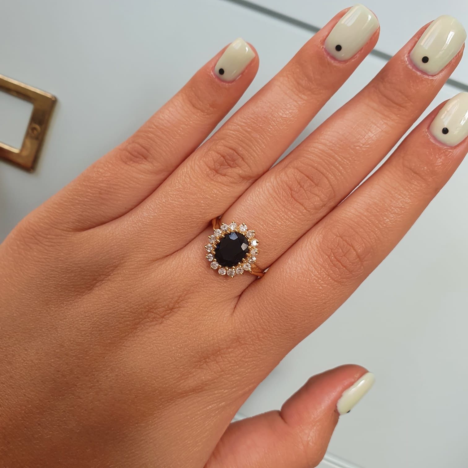 | תיאור טבעת זהב K14. טבעת משובצת אבן חן ספיר כחולה וזרקונים. מדובר בעיצוב המוכר ביותר בעולם של טבעת אירוסין. טבעת כזו בדיוק העניק הנסיך צ'ארלס לנסיכה דיאנה אשר על שמה הטבעת. |