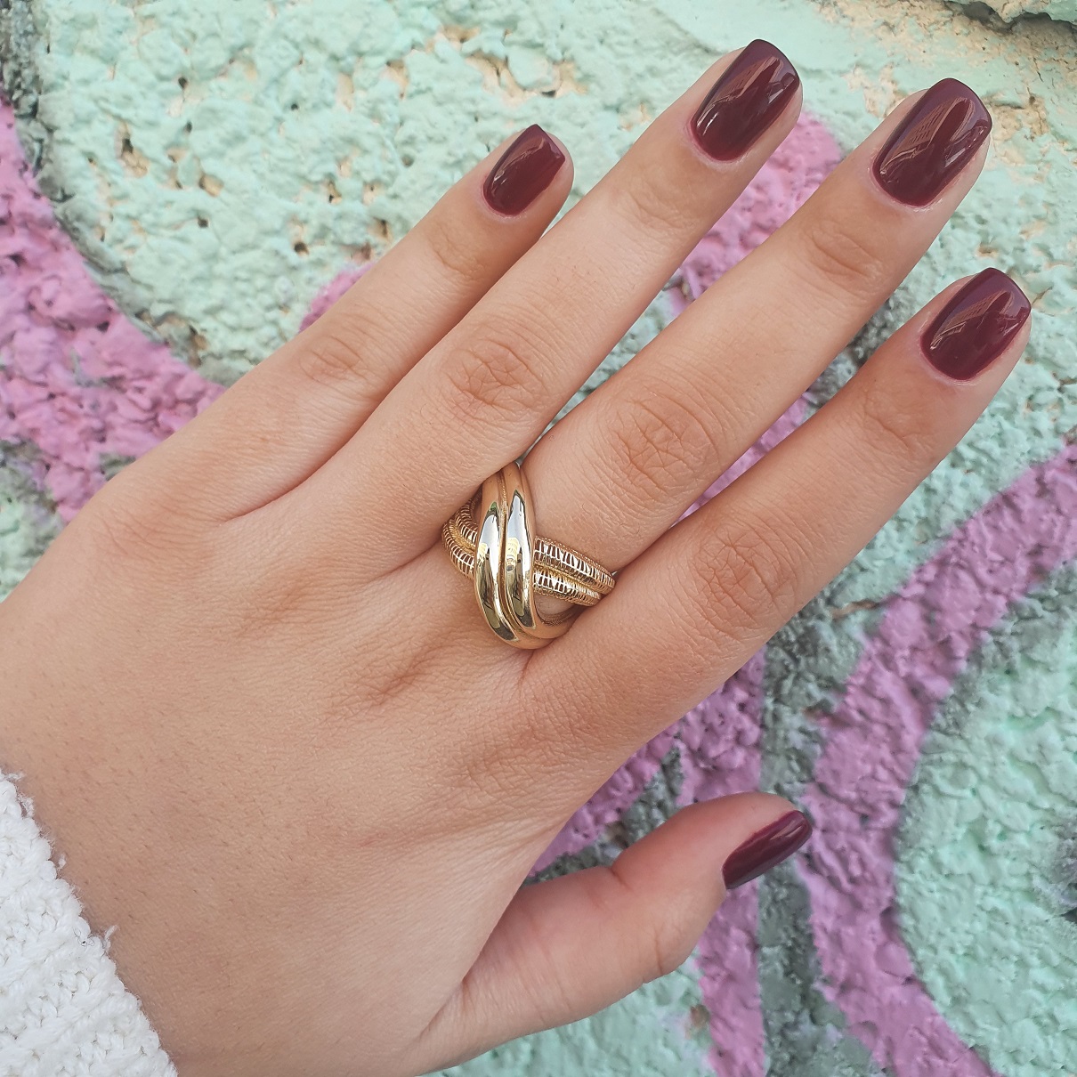 | תיאור טבעת זהב צהוב 14K. טבעת מיוחדת בסגנון טוויסט. טבעת מרשימה ובעלת נוכחות. |
