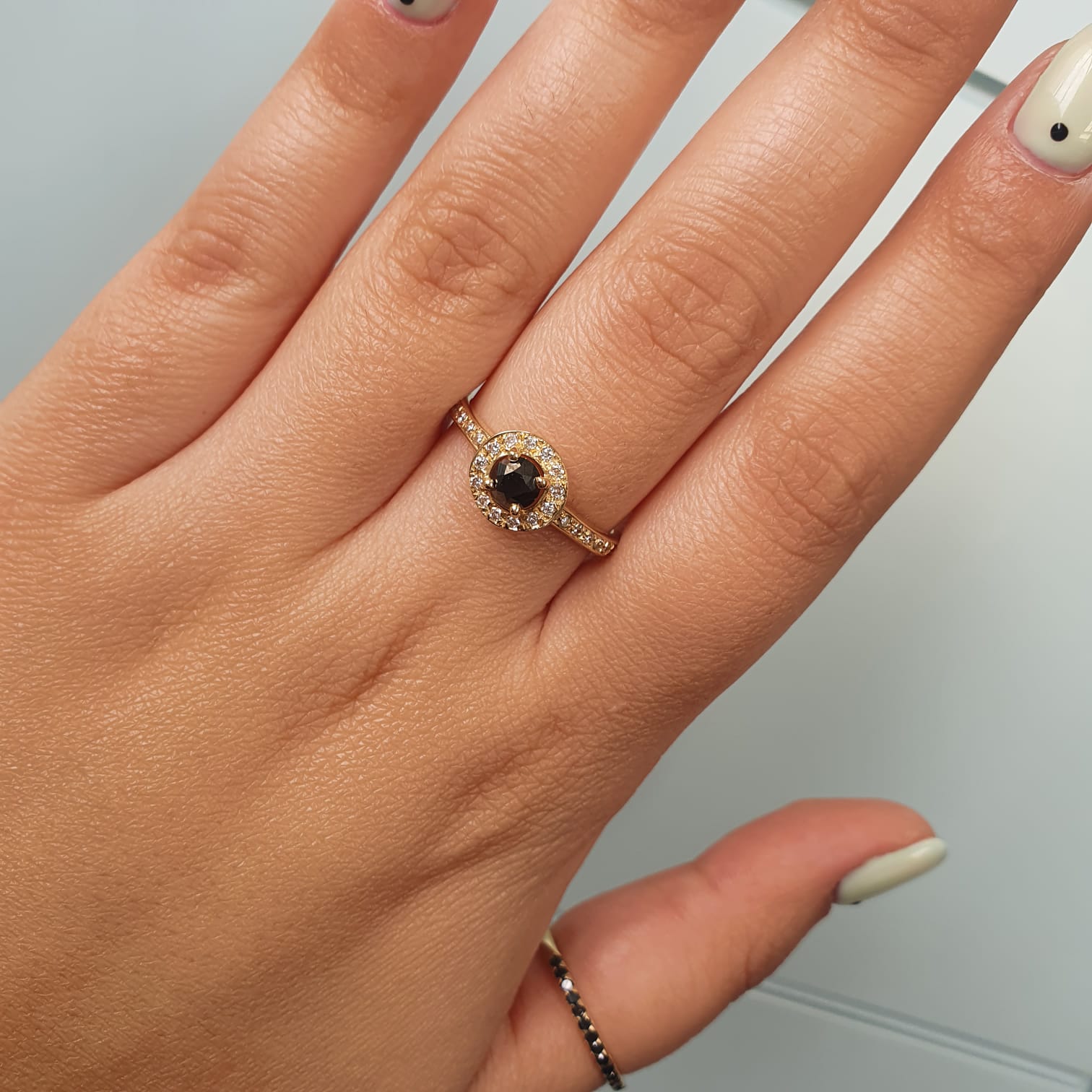 טבעת "האלו" משובצת יהלומים לבנים במשקל 0.20 קראט מסביב ליהלום שחור במרכז ו"מקשטות" אותו , טבעת אירוסין קסומה