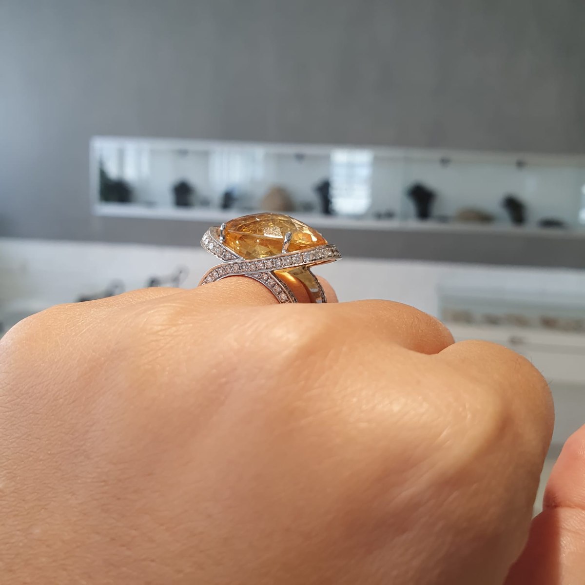 | טבעת זהב K18. טבעת יהלומים 1.4 קראט משובצת אבן חן סיטרין טבעית. טבעת עם טוויסט, מרשימה ובעלת נוכחות. |