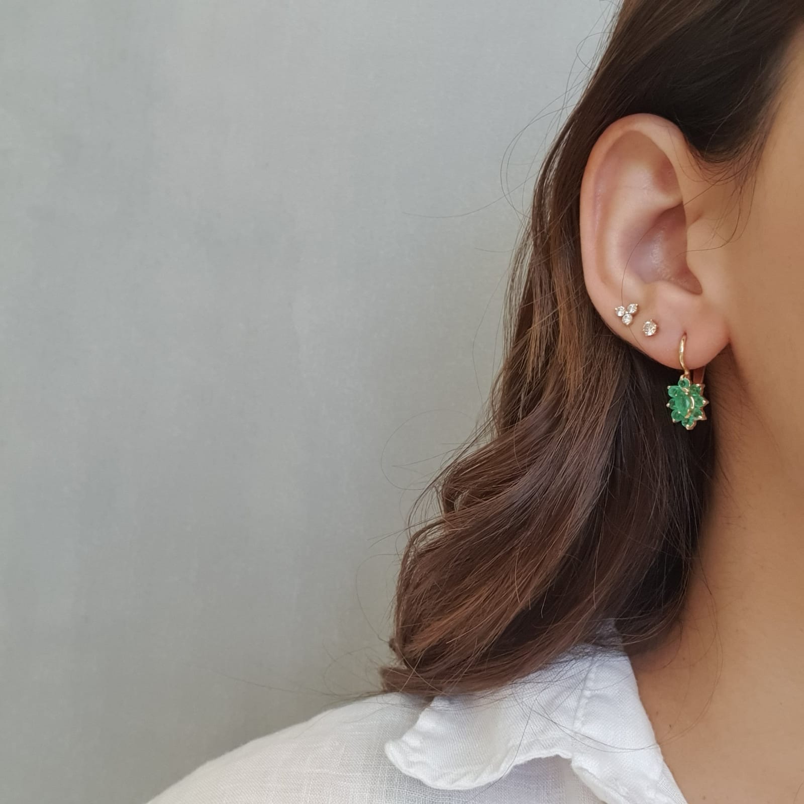 | תיאור עגילי זהב K14 נתלים משובצים באבן חן אמרלד . האבן המרכזית בחיתוך מרקיזה ומסביב הילה של אבני חן קטנים בצבע ירוק . |