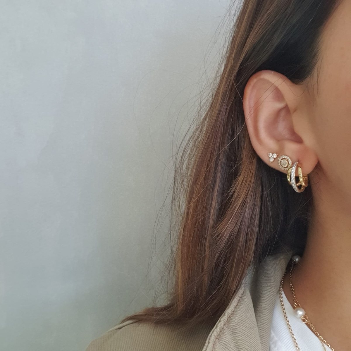 | תיאור עגילי זהב צהוב מעוצבים כחצי חישוק שחובק את האוזן עם שורה של אבנים משובצות לאורכו, להשלמת המראה הזוהר והיוקרתי. |